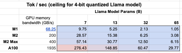 A Mac M2 Max is 5-6x faster than a M1 for inference due to the larger GPU memory bandwidth.